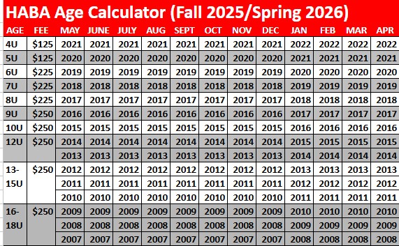 HABA offers multiple different age groups of league baseball, which can be found below. Please note, depending on the season, some age groups will be combined or separated. For example, 7U and 8U are listed as separate age groups but may be combined if the numbers don't support two age groups.